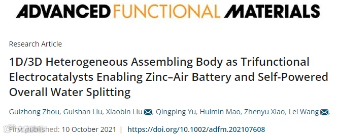 Guizhong Zhou, Guishan Liu, Xiaobin Liu,* Qingping Yu, Huimin Mao, Zhenyu Xiao, and Lei Wang*. 1D/3D Heterogeneous Assembling Body as Trifunctional Electrocatalysts Enabling Zinc–Air Battery and Self-Powered Overall Water Splitting. Adv. Funct. Mater. 2021, 2107608.