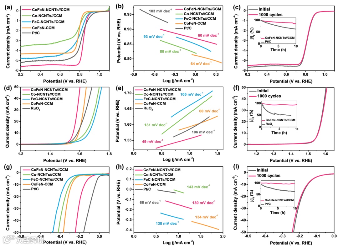 图 3. a) 0.1 M KOH中1600 rpm下的氧还原反应(ORR)极化曲线,以及相应的b) Tafel斜率和 c) 稳定性测试。d) 1.0 M KOH中的析氧反应(OER)极化曲线,以及相应的 e) Tafel斜率和 f) 稳定性测试。g) 1.0 M KOH中的析氢反应 (HER) 极化曲线,以及相应的 h) Tafel斜率和 i) 稳定性测试。