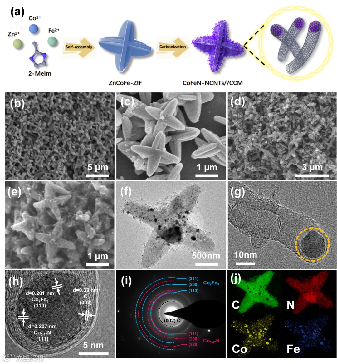 图 1. a) CoFeN-NCNTs//CCM合成路线示意图。b,c) ZnCoFe-ZIF的扫描电子显微镜(SEM)图像,CoFeN-NCNTs//CCM的d,e) SEM,f,g) 透射电子显微镜 (TEM),h) 高分辨率TEM (HRTEM),i) 选区电子衍射(SAED)图案,和j) 元素映射图像。