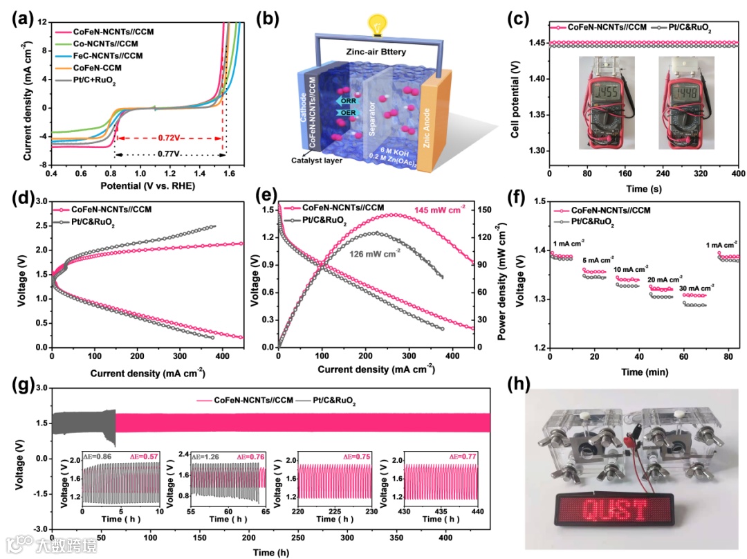 图 4. a) 不同催化剂的双功能活性。CoFeN-NCNTs//CCM和Pt/C&RuO2基锌-空气电池的b) 示意图。c) 开路电压,d) 充放电极化曲线,e) 功率密度曲线,和 f) 不同电流密度下的放电曲线,以及 g)恒电流放电-充电循环曲线。h) 由两个串联锌-空气电池供电的发光二极管 (LED) 屏幕的数码照片。