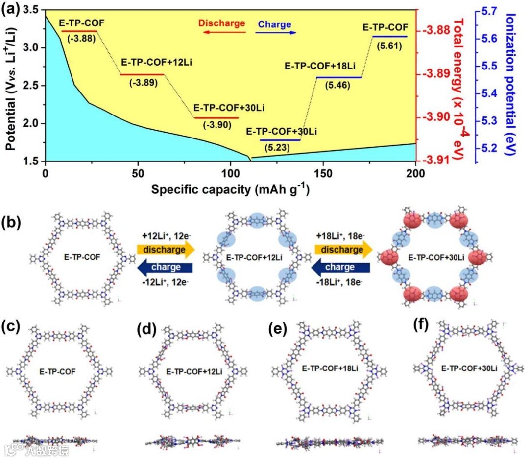 Figure 4. Proposed lithiation pathway for the E-TP-COF electrode. The left axis shows the redox potential vs Li+/Li, and the right axis shows the total energy and ionization potential of various lithiated E-TP-COF structures (a). Structural evolution during the lithiation/delithiation procedure (atomic colors: white: H, gray: C, red: O and blue: N) (b). The binding sites between Li and the C=O and C=N groups are indicated by blue and red spheres, respectively. Schematics of the optimized structures at different stages of Li of E-TP-COF (c), E-TP-COF+12Li (d), E-TP-COF+18Li (e) and E-TP-COF+30Li (f), respectively.