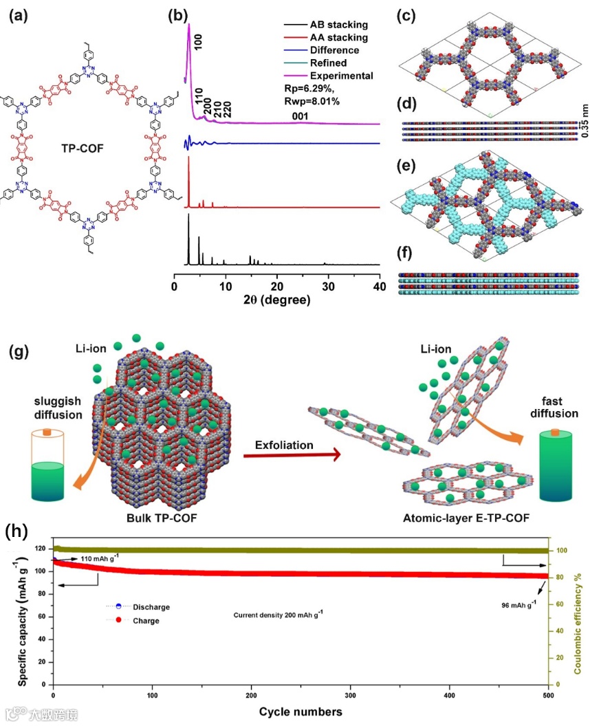 Figure 1. Chemical structure of dual-active-center modified TP-COF (a); PXRD patterns of TP-COF with experimental, Pawley refined, difference, AA stacking and AB stacking (b); calculated models for AA-stacking (c and d) for AB-stacking (e and f); the schematic representation of exfoliated process for TP-COF into E-TP-COF as cathodes for Li-ion battery (g).