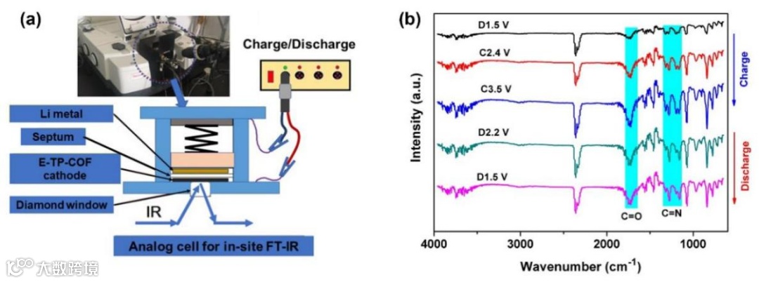 Figure 3. The in-situ FT-IR spectrum equipment pattern (a) and spectral changes of the E-TP-COF electrode at different discharge and charge states (b).
