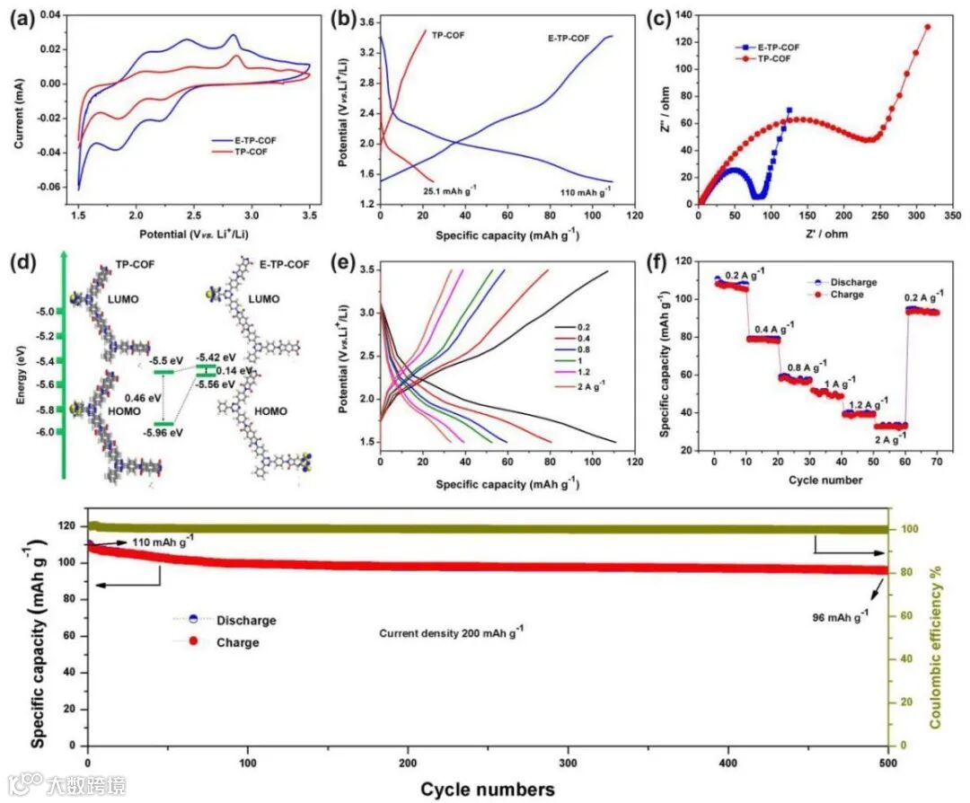 C=O和C=N双重活性位点的原子层厚度的E-TP-COF正极材料,并成功应用于锂离子电池。E-TP-COF丰富的C=O和C=N氧化还原位点、大的共轭结构、高的比表面积和多孔结构,原子层厚度结构有利于活性位点的暴露和利用,缩短了锂离子的扩散距离,提高扩散速率,促进高容量的保持和快速的Li储存(图2)。