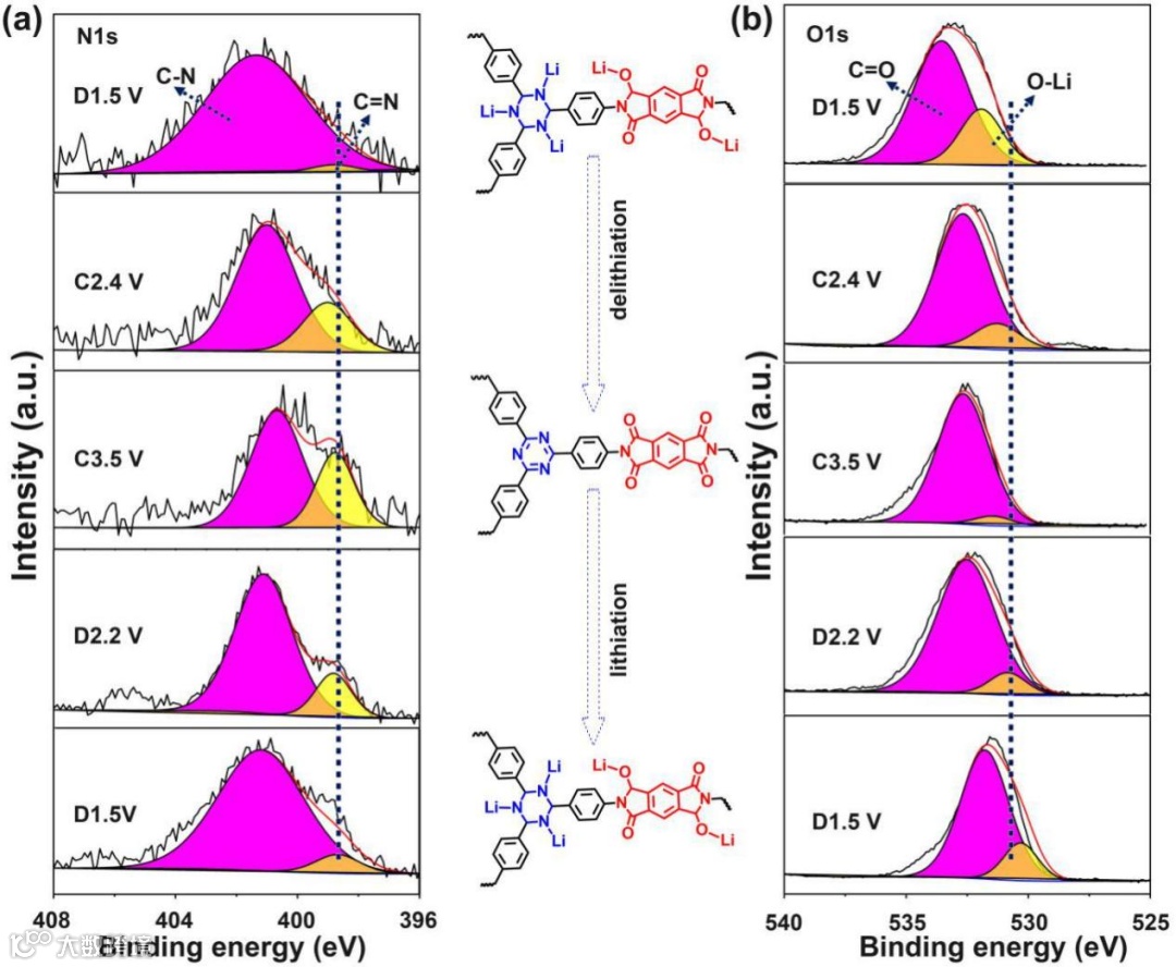 利用原位表征手段以及准原位和DFT理论计算的方式明确了双位点储锂的机制,C=O与C=N跟Li锂离子之间的相互作用是一个可逆的过程,为其他金属离子的设计和开发奠定基础,提供方向(图3-5)。