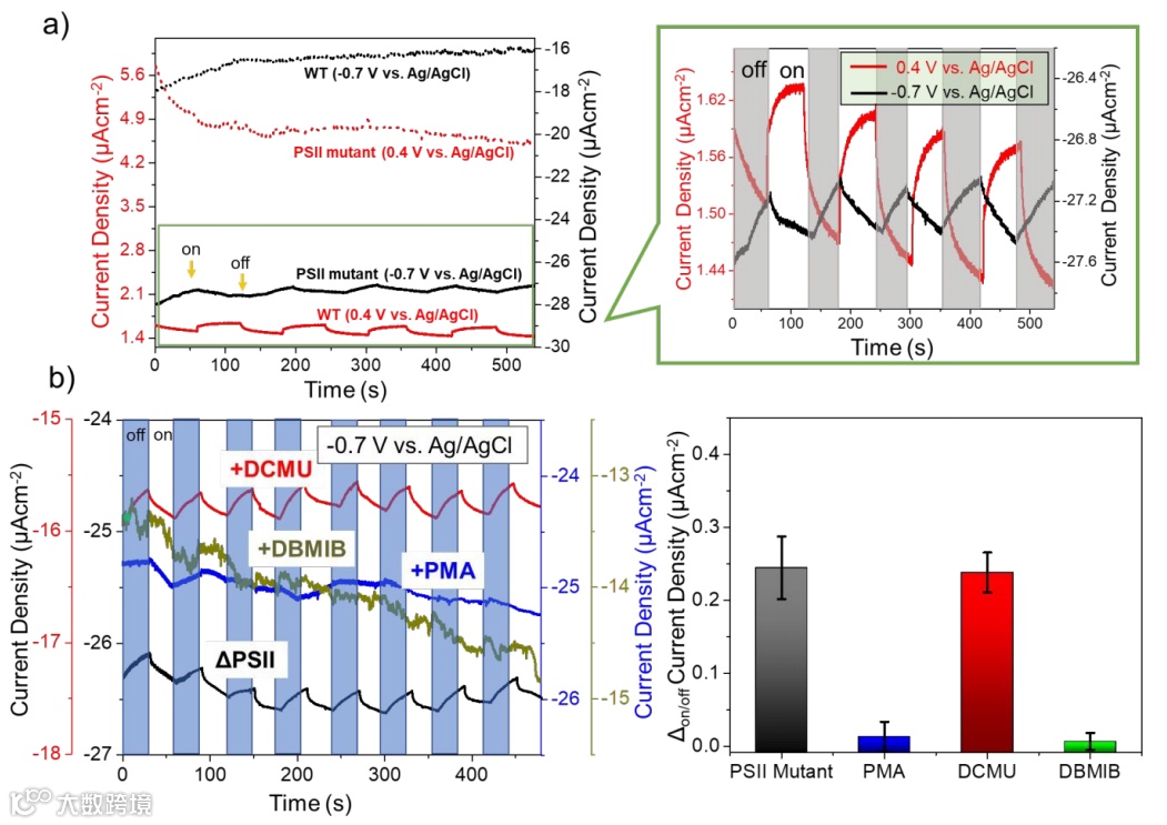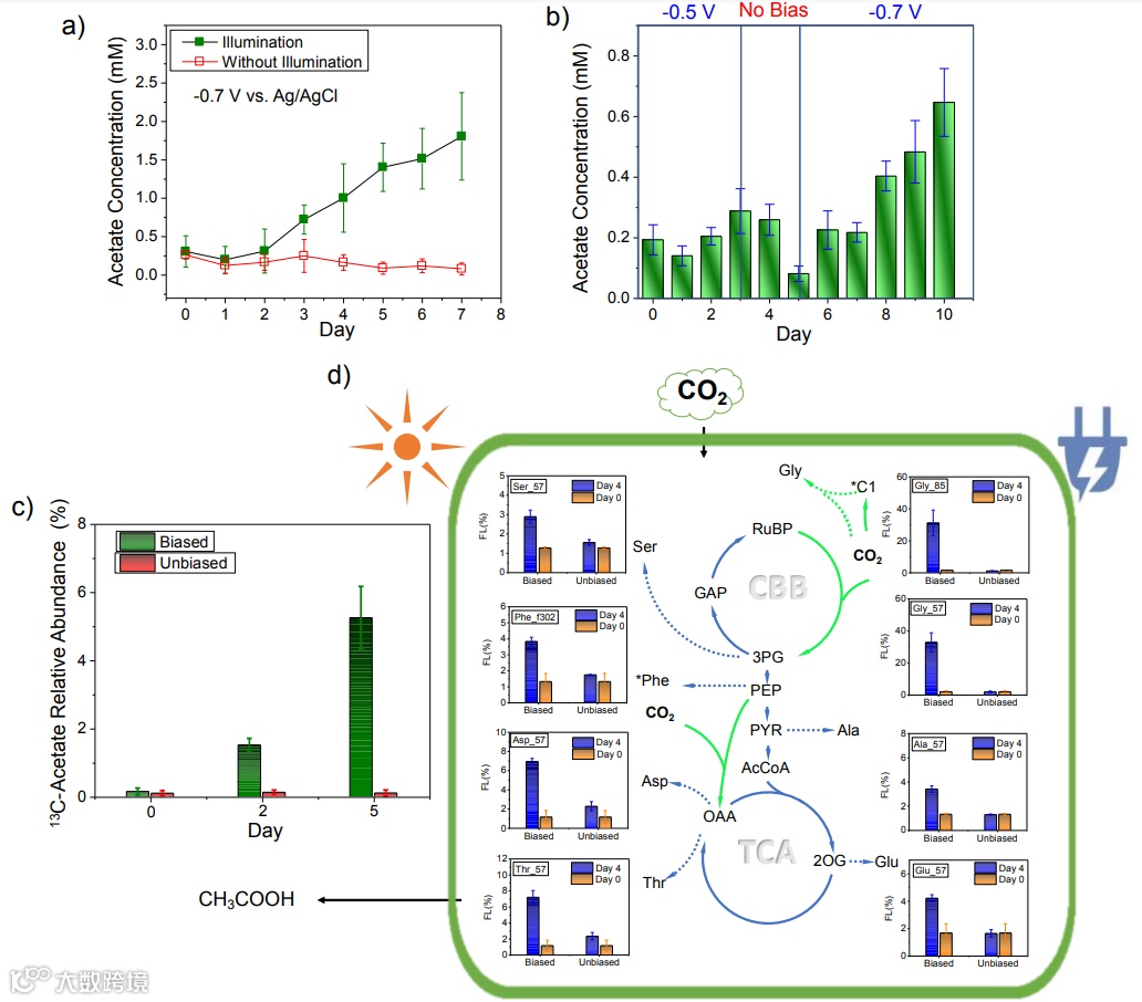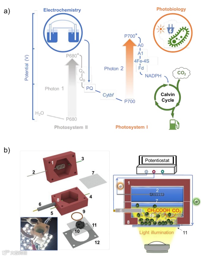 研究表明,该架构电化学界面处的阴极蓝藻细胞缺乏光系统II的活性,因此不能独立进行光合作用。在照明后,阴极通道电子会从光系统I外部电路传输到细胞内的PETC中,从而促进蓝藻将CO2还原转化为乙酸盐。