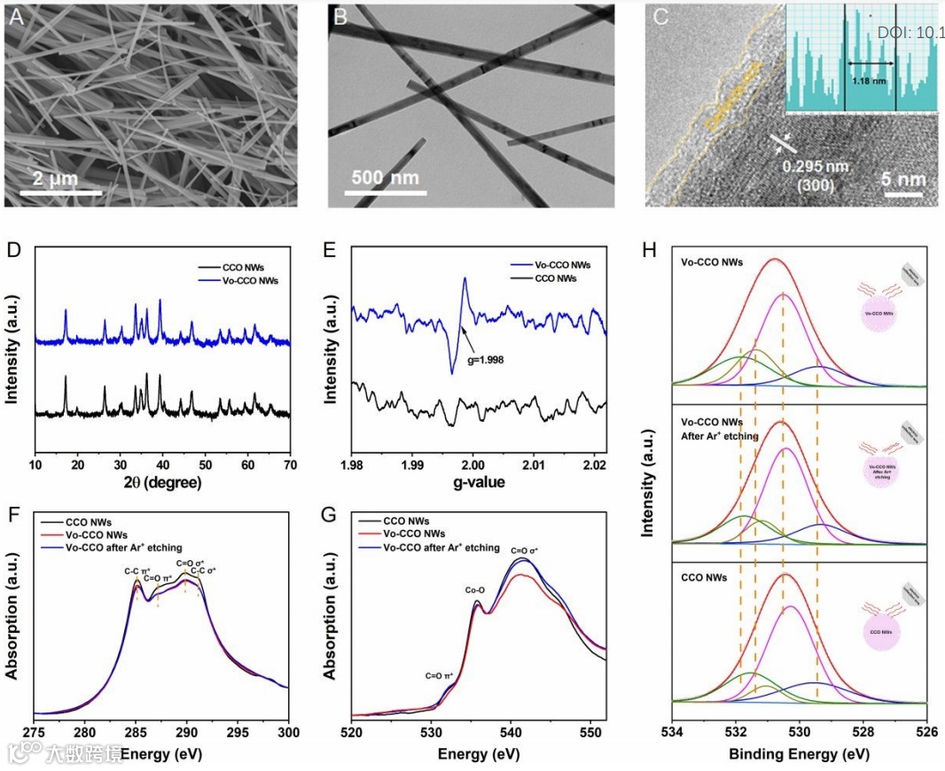 在本文中,作者通过温和的自光刻技术制备出富含Vo的Co(CO3)0.5(OH)·0.11H2O纳米线,以下简称为Vo-CCO NWs。一系列表征证明Co位点处的Vo仅仅产生于Vo-CCO NWs的表面。