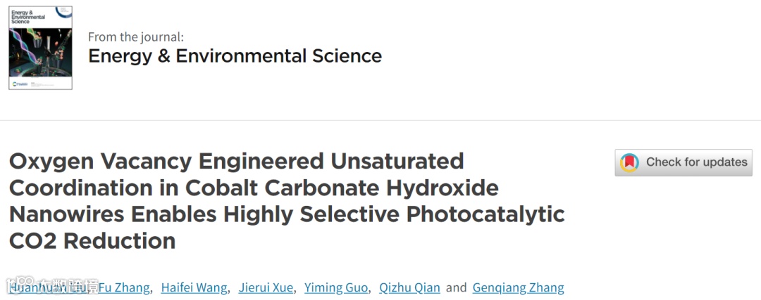 Huanhuan Liu, Fu Zhang, Haifei Wang, Jierui Xue, Yiming Guo, Qizhu Qian, Genqiang Zhang. Oxygen Vacancy Engineered Unsaturated Coordination in Cobalt Carbonate Hydroxide Nanowires Enables Highly Selective Photocatalytic CO2 Reduction. Energy Environ. Sci. 2021. DOI: 10.1039/D1EE01397A.