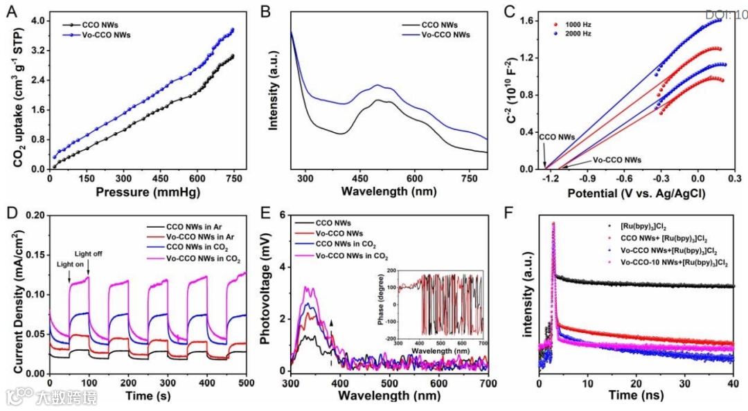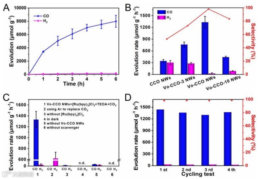 测试结果表明,所合成出的Vo-CCO NWs催化剂在可见光下具有优异的光催化CO2还原活性,CO产率高达1333.20 μmol h−1 g−1,且具有98.2%的杰出选择性。