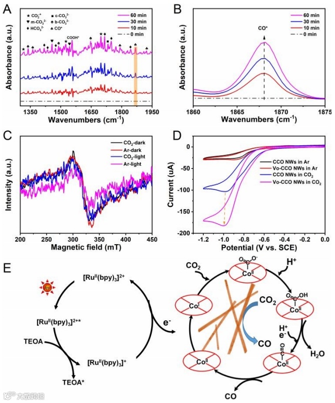 结合原位FTIR、CV、原位EPR分析表明,该CO2还原催化机制为典型的CoII/CoI反应路径。首先,光敏剂([Ru(bpy)3]2+)通过可见光照射被激发到激发态([Ru(bpy)3]2+*),随后[Ru(bpy)3]2+*被TEOA淬灭得到[Ru(bpy)3]+还原物种。该还原物种将向Vo-CCO NWs提供激发电子以促进CO2还原反应,同时Vo-CCO中的Co2+被光激发电子还原为Co+。随后,电子被转移至吸附在光催化剂表面的CO2亲电加成物上,而Co+随着*CO2-的生成转变为Co2+。之后*CO2-切换至吸附CO中间体(CO*),最后吸附的中间产物从Co活性中心处解吸成为游离的CO分子。