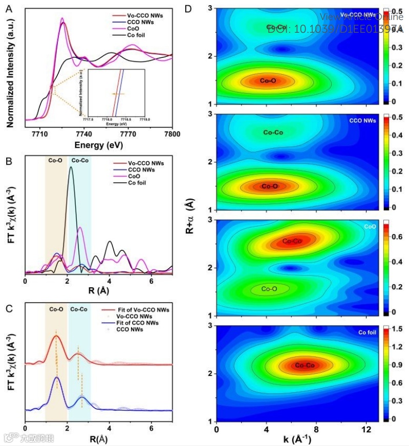 研究表明,CCO和Vo-CCO NWs材料的Co-K边吸收位置的前边缘与CoO接近,表明两种样品中均含有Co2+。但与CCO NWs相比,Vo-CCO NWs的Co-K-edge-XANES前边缘移动至较低的能量,为Vo-CCO NWs中Co位点上的不饱和配位导致部分表面还原提供了直接证据。