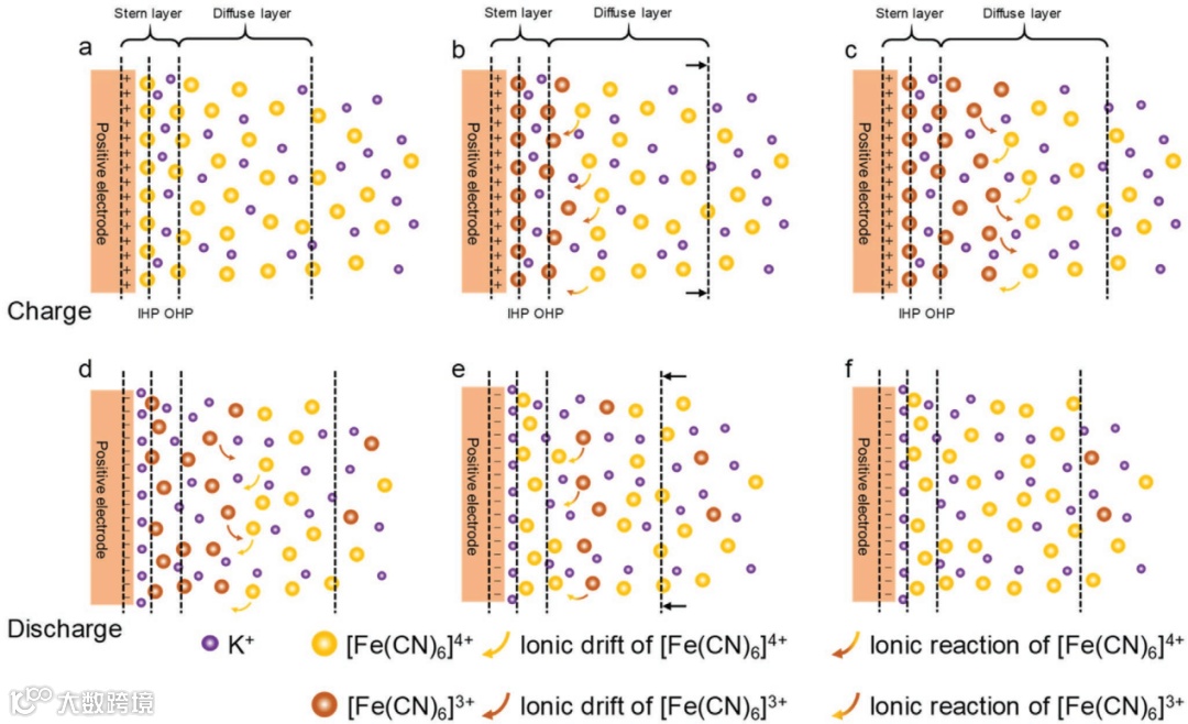 由于该方向上电场逐步递减,双电层内离子无法完全反应,但会通过反应区和未反应区的离子交换引入新的离子进行反应从而维持一个稳定的电流(if)。在此过程中漂移到电解质体相内的离子在放电过程中难以回到电极附近发生反应,从而降低了库仑效率。而在放电过程中,电极电性的改变对离子的静电排斥会进一步造成反应离子的损失,从而导致自放电效应并降低库仑效率。