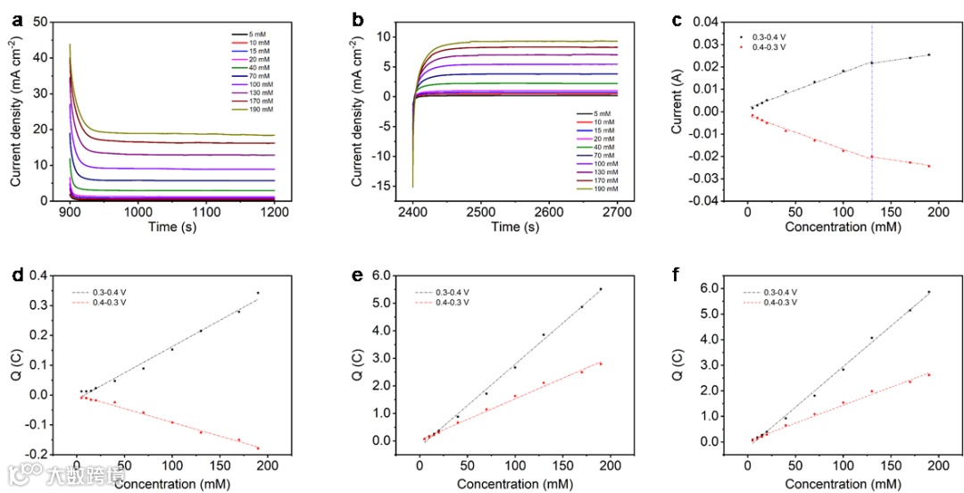图5. 阶跃电位分析方法对碳管电极在不同浓度氧化还原电解液中的电化学行为研究。