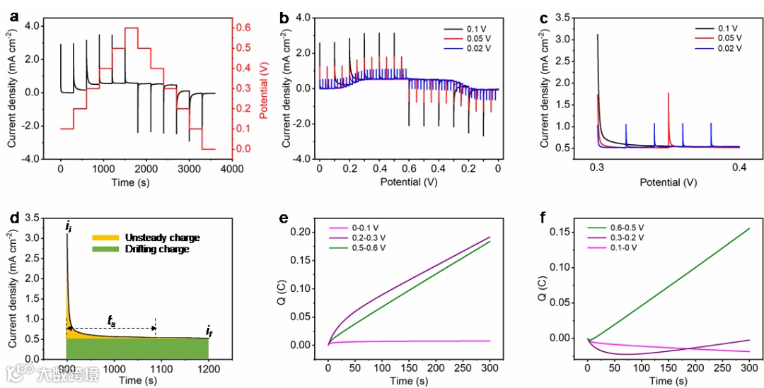 图3. 阶跃电位分析方法对碳管电极在氧化还原电解液中的电化学行为研究。