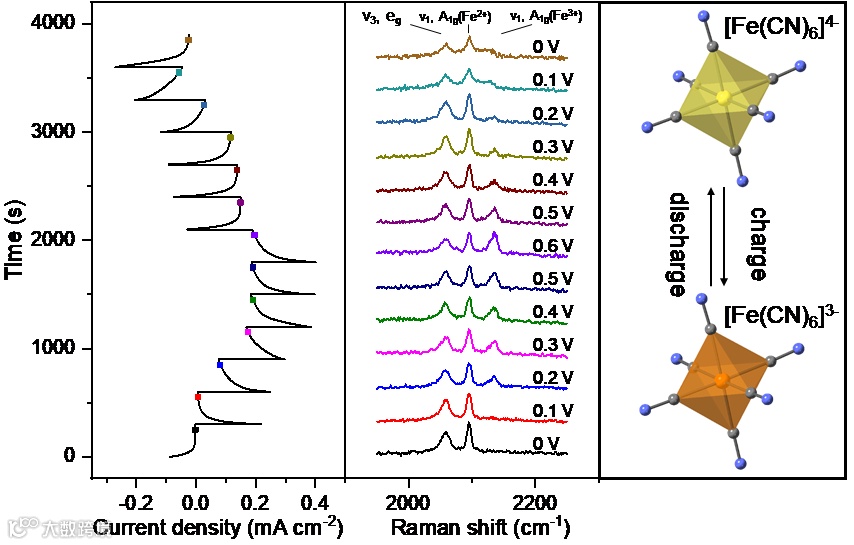 由于阶跃电位测试在每个反应阶段最终均使体系处于稳态,可与原位表征手段联用从而实时表征不同反应阶段的电化学状态,本文通过阶跃电位与原位拉曼表征联用实时观测亚铁氰根与铁氰根在不同电位下的转化,为反应机制分析提供充分的佐证。