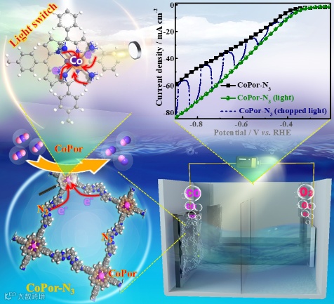 CoPor-N3拥有与叶绿色光敏成分相似的卟啉环结构,测试表明CoPor单元为聚合物的光开光,光助电催化能进一步使CoPor-N3拥有更低的过电位去实现90%以上CO法拉第效率。