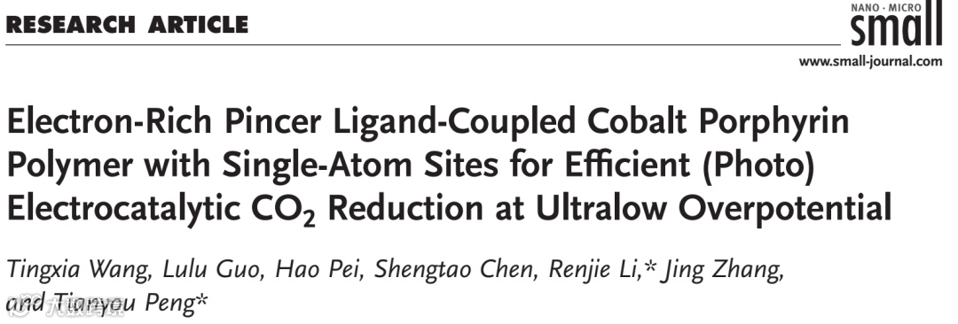 基于此,来自武汉大学的彭天右教授与李仁杰副教授,在国际知名期刊Small上发表题为“Electron-Rich Pincer Ligand-Coupled Cobalt Porphyrin Polymer with Single-Atom Sites for Efficient (Photo)Electrocatalytic CO2 Reduction at Ultralow Overpotential”的论文。