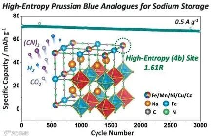 A high-entropy Prussian blue analogue, Nax(FeMnNiCuCo)[Fe(CN)6], is developed as a robust host structure for reversible sodium insertion. Battery cells using the new cathode active material show significantly improved cycling performance and stability, among others due to its nearly zero-strain operation.