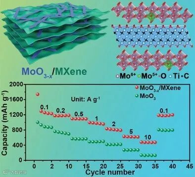 Oxygen vacancies-rich MoO3−x/MXene heterostructure is prepared through hydrazine hydrate reduction and electrostatic assembly, which exhibits superior electrochemical lithium-ion storage performances such as ultrahigh discharge capacity (1258 mAh/g at 0.1 A/g) and outstanding rate capability (474 mAh/g at 10 A/g), benefitting from the introduction of oxygen vacancies and MXene nanosheets.