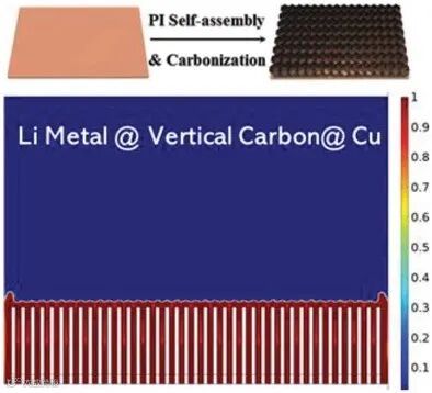 N, O-codoped vertical carbon nanosheet array is constructed on Cu foil (NOCA@Cu) as an efficient Li host through PI self-assembly and subsequent carbonization. Experiments and simulations indicate that 3D NOCA@Cu can confine Li plating in vertical porous channels and homogenize ion concentration and electrical field distributions throughout 3D electrode, leading to uniform Li deposition with high Coulombic efficiency and long cycle life.