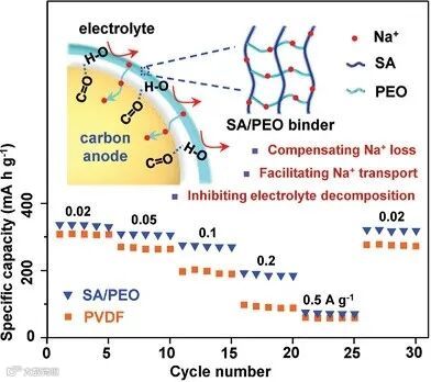 A trifunctional sodium alginate/polyethylene oxide (SA/PEO) binder is proposed for glucose-derived carbon anode, exhibiting excellent sodium storage properties. The initial Coulombic efficiency and capacity of the carbon anode using SA/PEO binder are 10% and 80 mAh g−1 higher than that of poly(vinylidene fluoride) (PVDF) binder, respectively, owing to synergic effects of extra Na+ sources, rich Na+ channels, and stable H-bonds.