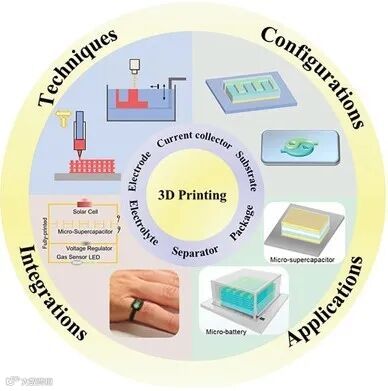 In this review, the applications of 3D printing techniques on different micro electrochemical energy storage devices such as micro-batteries, micro-supercapacitors, and metal ion hybrid micro-supercapacitors are reviewed. The process includes printing components (electrodes, current collectors, substrates, electrolytes, separators, and packages) with arbitrary shapes, fully printed devices with various configurations, and their integration for practical use.