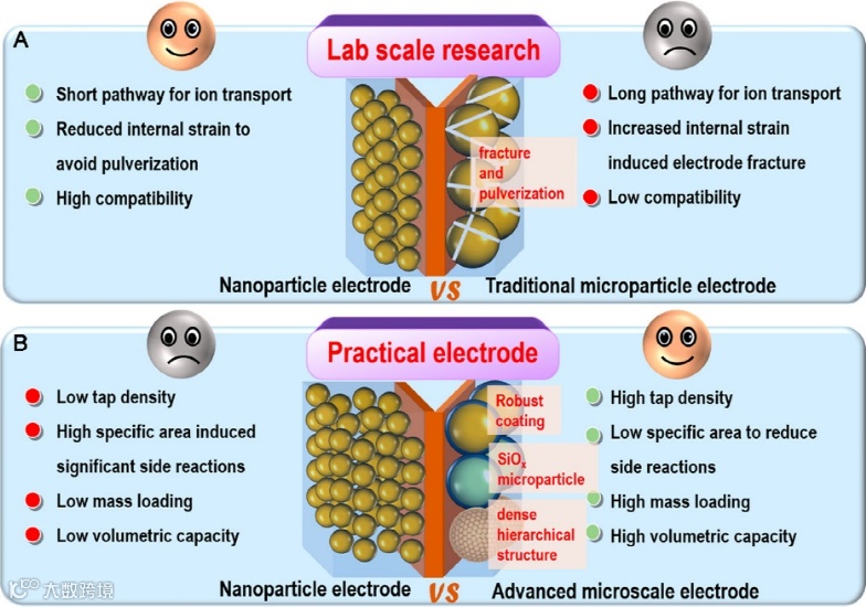 高能量密度LIBs依赖于高能量密度的电极材料,在众多的负极材料中,单质硅材料具有极高的理论容量和合适的脱/嵌锂电位,成为最有希望替代石墨的下一代商业负极材料。然而,硅在锂化/脱锂的过程中,会产生约300%的体积膨胀,导致电极内应力的增加,从而引发电极表面裂纹、破裂并最终粉化。此外,体积的巨大变化也会形成不稳定的固体电解质界面(SEI),最终将导致电极内部电接触失效和循环寿命快速下降等。虽然通过设计纳米结构能极大改善硅负极的电化学性能(图1A),但当在更实际的相关水平上进行评估时,众多报道的纳米硅基负极材料难以满足工业化需求。