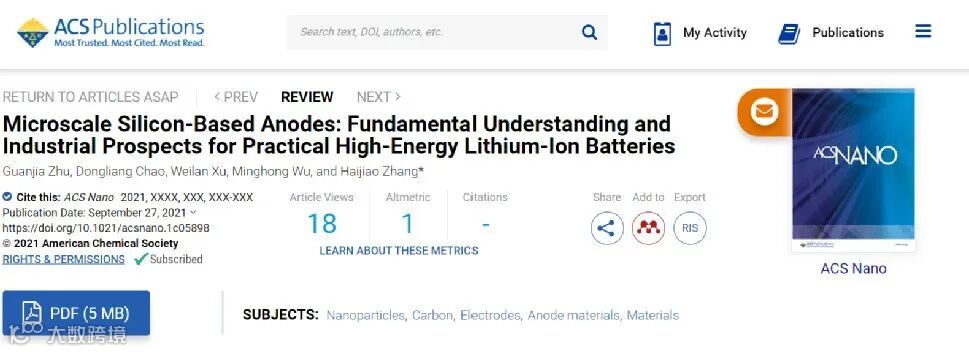 Guanjia Zhu, Dongliang Chao, Weilan Xu, Minghong Wu, and Haijiao Zhang*, Microscale Silicon-Based Anodes: Fundamental Understanding and Industrial Prospects for Practical High-Energy Lithium-Ion Batteries, ACS Nano 2021, https://doi.org/10.1021/acsnano.1c05898