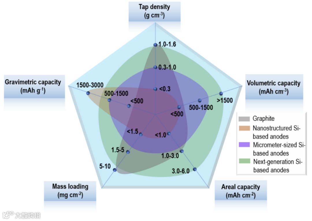 图2. 锂离子电池实用负极所需关键性能指标的综合对比图