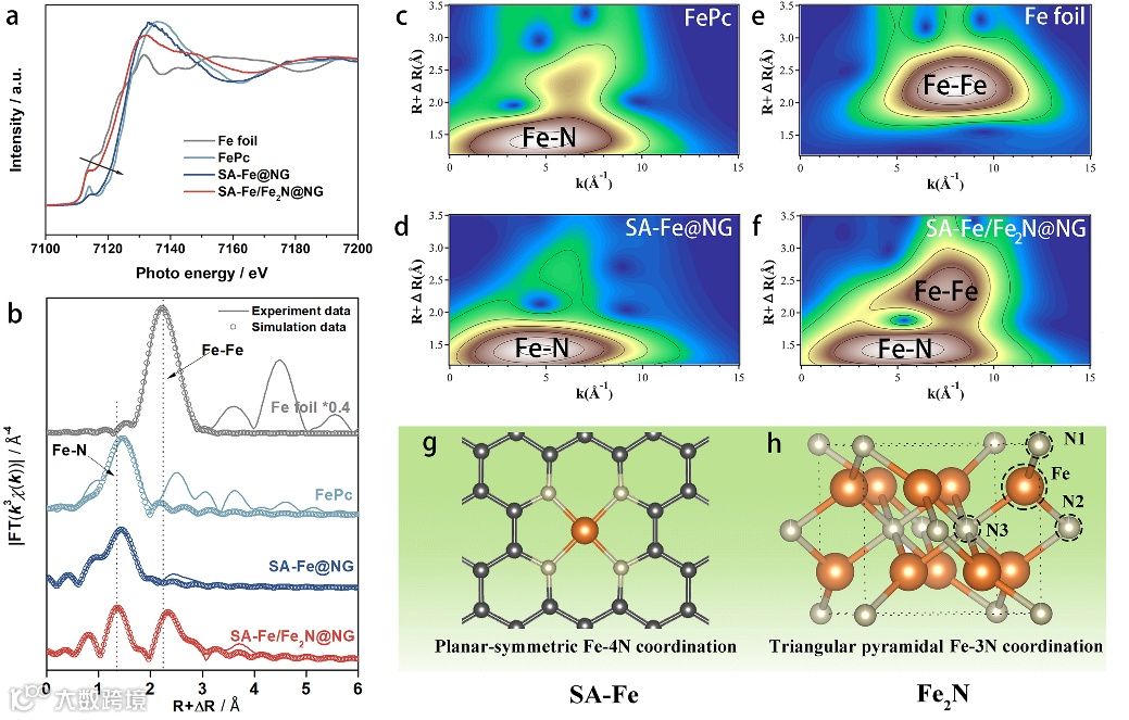 通过球差矫正扫描透射显微镜及高分辨同步辐射X射线吸收谱证明了SA-Fe及Fe2N纳米颗粒同时存在于SA-Fe/Fe2N@NG集成催化剂中,分别具有平面对称Fe-4N配位结构及空间三角锥Fe-3N配位结构