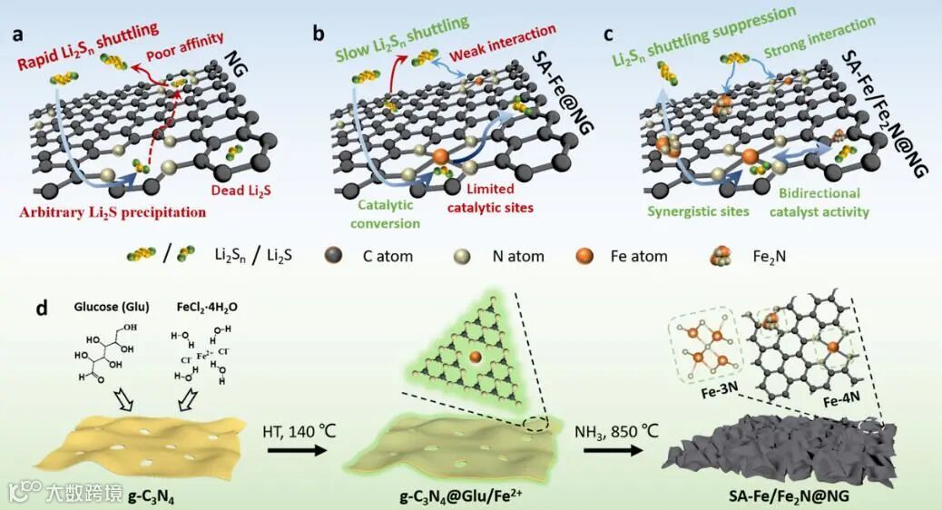 图1多硫化物在NG、SA-Fe@NG及SA-Fe/Fe2N@NG上吸附/转化机理示意图及SA-Fe/Fe2N@NG合成流程示意图。