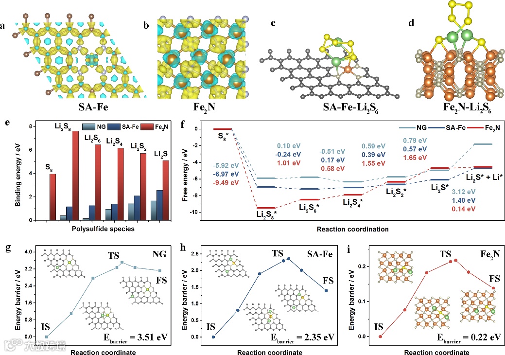结合电化学测试和DFT理论计算证明了SA-Fe中平面对称的Fe-4N配位结构主要作用于长链多硫化物Li2Sn的还原,而Fe2N中空间三角锥型的Fe-3N配位结构对Li2S的分解有明显催化作用。