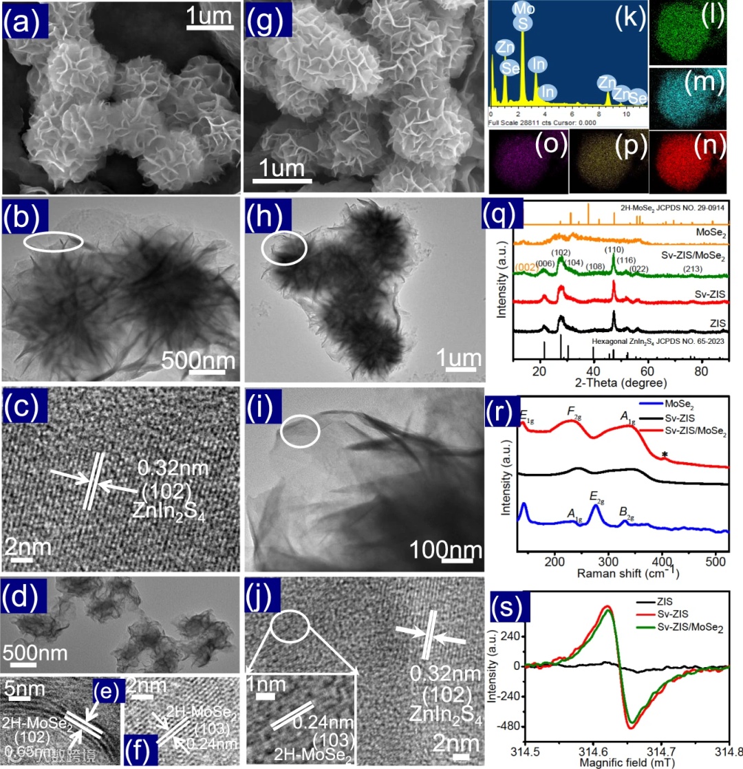 图 2. 形貌和成分表征。ZIS 的 a-c SEM、TEM 和 HRTEM 图片。MoSe2 的 d-f TEM 和 HRTEM 图像。Sv-ZIS/MoSe2 的 g-j SEM、TEM 和 HRTEM 图像。k-p EDS 和 Sv-ZIS/MoSe2 中的Zn、In、S、Mo、Se 的元素mapping图像。q,ZIS、Sv-ZIS、MoSe2 和 Sv-ZIS/MoSe2 的 XRD 图。r,Sv-ZIS、MoSe2 和 Sv-ZIS/MoSe2 的拉曼光谱,以及 s ZIS、Sv-ZIS 和 Sv-ZIS/MoSe2 的 EPR 光谱。