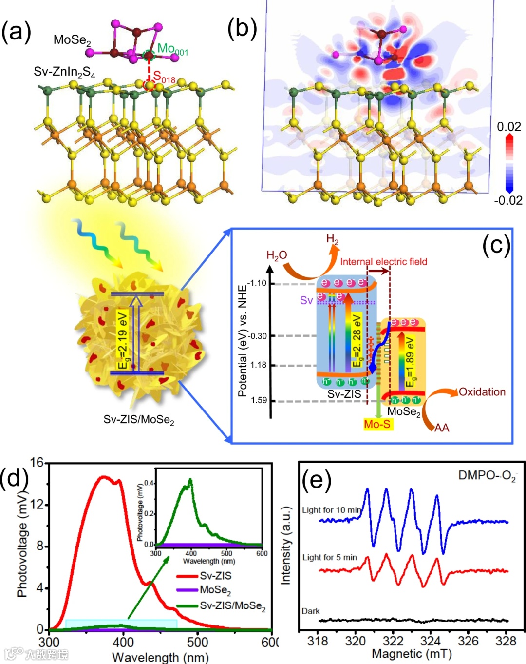 图 7. 光催化机理及证明。a Sv-ZnIn2S4/MoSe2异质结构的优化模型和b电荷密度差异的侧视图。c Sv-ZIS/MoSe2 在光照射下的光催化反应机理,d Sv-ZIS、MoSe2 和 Sv-ZIS/MoSe2 的表面光电压 (SPV) 测试,以及 e Sv-ZIS/MoSe2 在甲醇溶液中的DMPO自旋俘获电子顺磁共振 (EPR) 光谱。