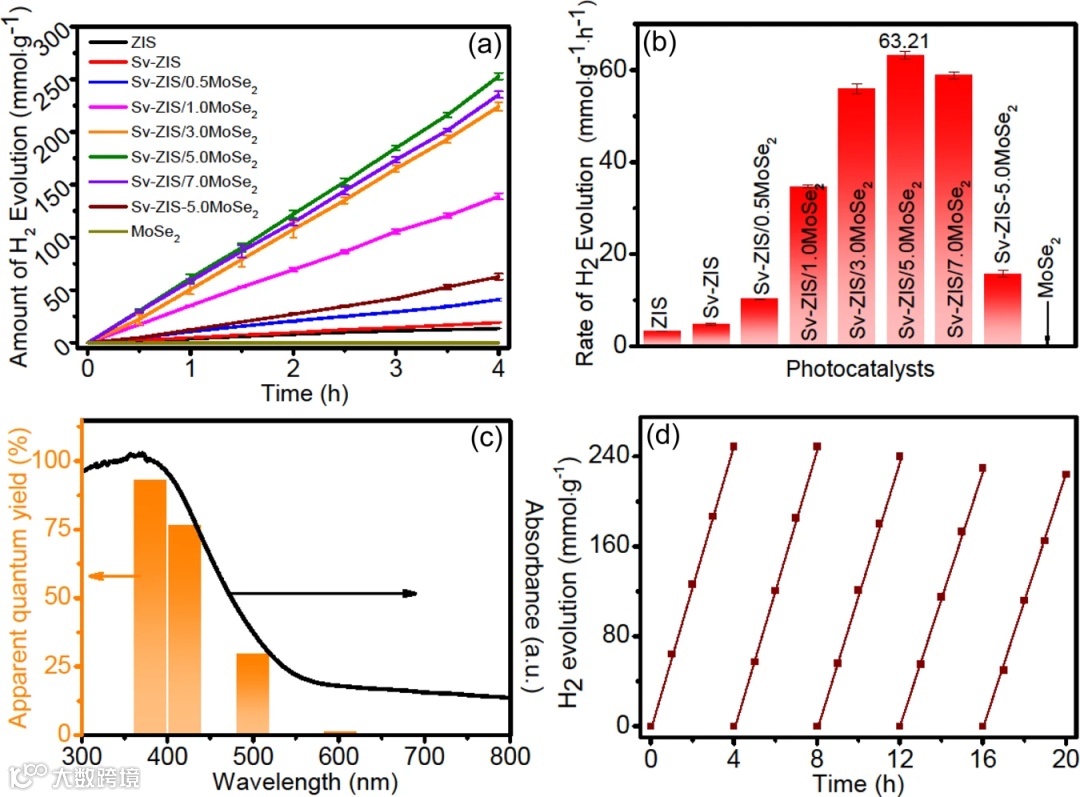 此外,丰富的 S 空位也有助于增强光吸收和加速光载流子分离。以上因素共同实现了 Sv-ZnIn2S4/MoSe2 的高效光催化性能。具体而言,优化后的光催化剂在 420 nm 处表现出 76.48% 的高 AQY,在可见光(λ > 420 nm)下具有 63.21 mmol·g-1∙h-1 的超高析氢率,约为ZnIn2S4的18.8 倍。此外,Sv-ZnIn2S4/MoSe2还表现出良好的循环稳定性,在 5 次连续光催化测试 20 h 后仍保持在 90% 以上的速率保持率。