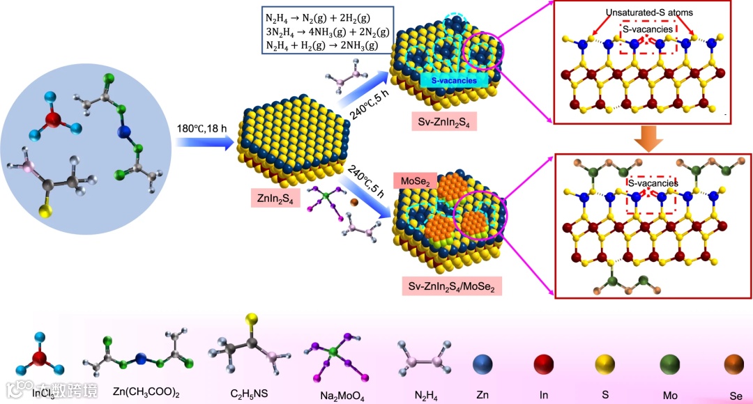 图 1. Sv-ZnIn2S4 和 Sv-ZnIn2S4/MoSe2 异质结构的合成路线示意图。