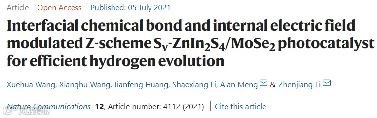 Wang, X., Wang, X., Huang, J. et al. Interfacial chemical bond and internal electric field modulated Z-scheme Sv-ZnIn2S4/MoSe2 photocatalyst for efficient hydrogen evolution. Nat Commun 12, 4112 (2021). https://doi.org/10.1038/s41467-021-24511-z