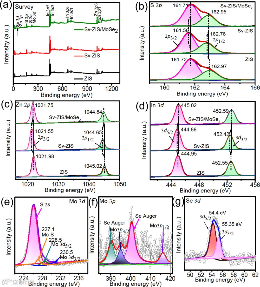 图 3. ZIS、Sv-ZIS 和 Sv-ZIS/MoSe2的a survey,b S 2p,c Zn 2p,d In 3d XPS光谱。Sv-ZIS/MoSe2 的 e Mo 3d 和 S 2 s,f Mo 3p 和 g Se 3d XPS光谱。