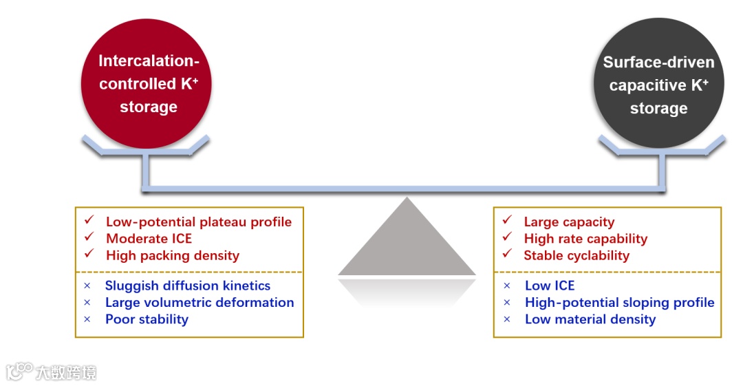 图1. 插层控制和表面赝电容驱动K+存储机制及其各自优缺点的平衡示意图。