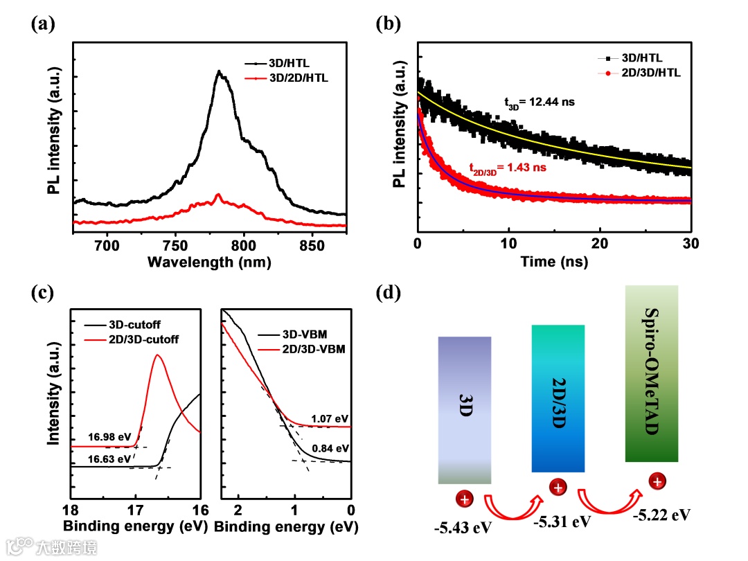 图1:3D/HTL和2D/3D/HTL的(a)稳态和(b)瞬态PL图及UPS图(c)和能带示意图(d)。