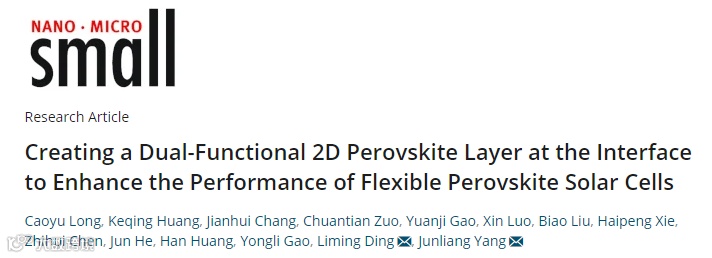 基于此,中南大学阳军亮教授团队与国家纳米科学中心丁黎明教授团队合作,在国际知名期刊 Small 上发表题为“Creating a Dual-Functional 2D Perovskite Layer at the Interface to Enhance the Performance of Flexible Perovskite Solar Cells”的研究成果。