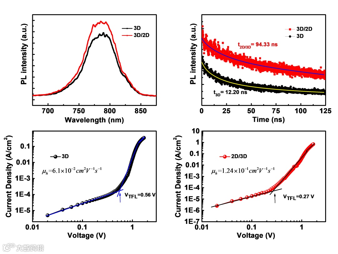 图2: 3D钙钛矿和2D/3D钙钛矿的PL及SCLC曲线。
