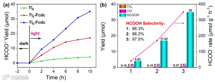 基于Ti6,Ti8-Fcdc和Ti6-Fcdc的以上优势,作者将其作为光催化剂在可见光下,水和三异丙醇胺(牺牲剂)溶液中进行了光催化CO2还原反应测试。测试时作者发现,Ti6,Ti8-Fcdc和Ti6-Fcdc均可以选择性的将CO2光还原为HCOO‾。其中Fcdc功能化的Ti8-Fcdc和Ti6-Fcdc光催化CO2还原反应的活性(170.30 μmol/g/h和350.00 μmol/g/h)远高于Ti6。
