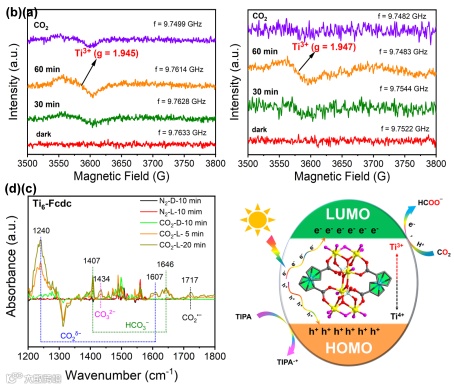 ESR结果显示,这些功能化的PTCs中的Ti4+离子是光催化CO2RR的活性中心。FTIR测试结果表明,CO2自由基、羧酸盐(CO2δ-)、碳酸氢盐和碳酸盐是该光催化反应中的重要反应中间体。
