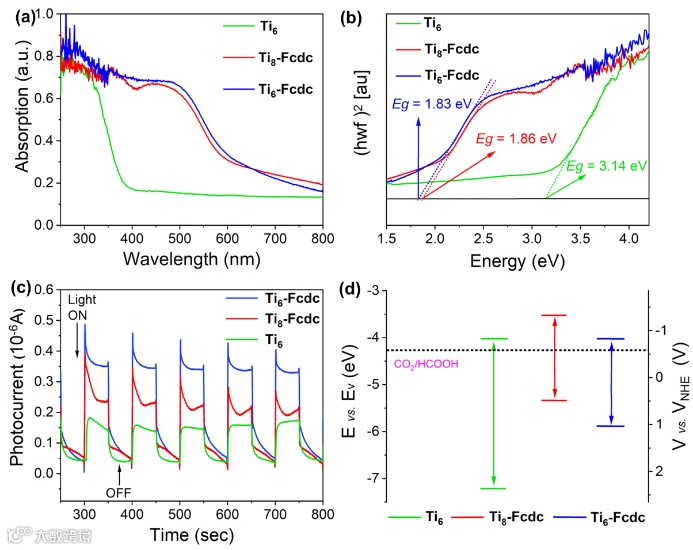 通过对Ti6,Ti8-Fcdc和Ti6-Fcdc的光学性质表征,作者发现,与Ti6相比,在多氧钛簇中成功引入具有快速电子转移能力的Fcdc配体,钛氧核与Fcdc配体之间发生了明显的电子转移效应,使功能化的Ti8-Fcdc和Ti6-Fcdc的光吸收范围从传统的紫外区拓展到可见光区域,带隙明显减小,光电流响应显著提高。
