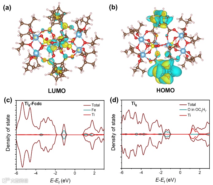 DFT计算结果表明,Fcdc功能化的多氧钛团簇的电子跃迁主要是从Fcdc配体的Fe 3d轨道跃迁到钛氧核的Ti 3d轨道。通过电子结构分析,态密度(DOS)结果显示,在Ti6-Fcdc结构中,Ti原子在总DOS中的占比比较小,这表明Ti6-Fcdc的LUMO轨道更加离域。