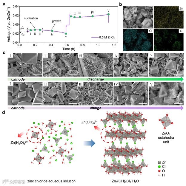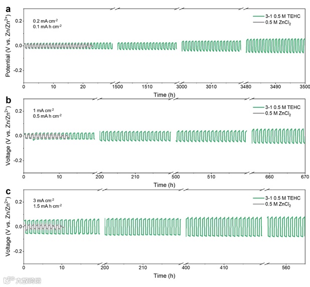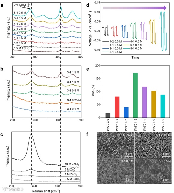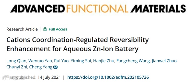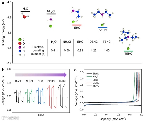 近日,清华大学深圳国际研究生院杨诚课题组在Advanced Functional Materials上发表了一篇题目为“Cations Coordination-Regulated Reversibility Enhancement for Aqueous Zn-Ion Battery”的文章。该论文的第一作者为硕士生钱龙,共同第一作者为姚文涛博士后,通讯作者为杨诚副研究员。该研究基于富水电解质系统,从常规的ZnCl2和ZnSO4电解质出发,利用非原位SEM和XRD等分析表征探索了大电流密度下(5 mA cm-2)Zn负极表面演化过程。通过对锌金属沉积剥离过程的研究,作者意外发现,在锌金属沉积过程中发生了副产物的形核生长,而恒流充放电过程与其形核生长有着显著的联系。此外,作者也指出了副产物生长的相关机制,即Zn(H2O)62+在电化学过程脱氢重组形成副产物。进一步的,基于对锌负极演化机制的研究,该文提出了利用少量强竞争作用的配体分子就能有效与大量弱竞争作用的水分子竞争Zn2+的配位。作者选择了一种(零、一、二、三)乙胺盐酸盐体系(工业上可由氨气,乙醇为原料合成),通过给电子乙基不断地进行取代从而实现配体分子给电子能力的连续提升。利用这一系列得到的配体分子配制了相应的电解质并进一步通过实验测试验证了其效果,即少量强竞争能力的配体分子即能够形成有效的溶剂化结构,从而实现了富水基电解质的开发。基于该电解质组装的锌锰全电池相较于未改性的电解质,其循环稳定性有了极大的提升。该文创新性的指出了一种锌离子电池负极的失效过程与机制,并且为开发富水基锌离子电池电解质提供了一种颇有前景的方法。