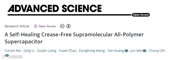 基于此,香港城市大学支春义教授与哈尔滨工业大学(深圳)黄燕教授、魏军教授合作,在国际知名期刊Advanced Science上发表题为“A Self-Healing Crease-Free Supramolecular All-Polymer Supercapacitor”的文章。