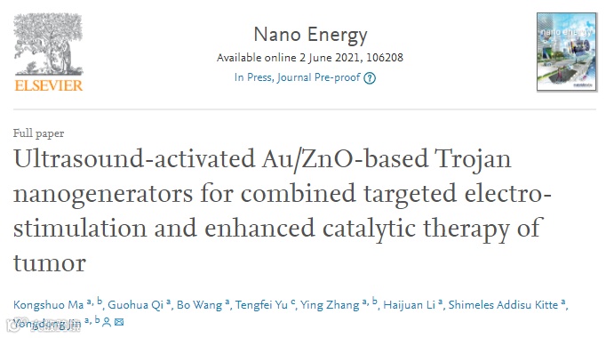 近期,相关成果以“Ultrasound-activated Au/ZnO-based Trojan nanogenerators for combined targeted electro-stimulation and enhanced catalytic therapy of tumor”为题发表在国际知名期刊Nano Energy上。