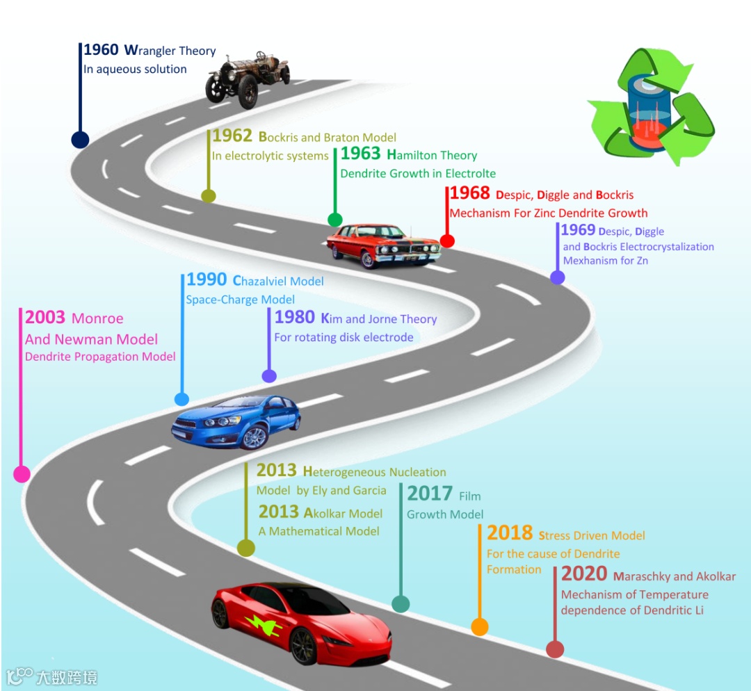 目前,研究者们提出了许多描述枝晶形成和早期生长的模型和理论,包括Wranglen理论、Bockris-Barton模型,Kim-Jorne理论、Bockris-Barton模型、Chazalviel模型、沉积溶解模型、异质成核模型、应力驱动的枝晶生长模型、Akolkar模型,Monroe-Newman模型等 (图2)。